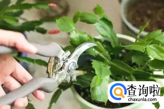 蟹爪兰的剪枝。在蟹爪兰的培育中,有时一个节片的顶端会长出4个至5个新枝,为保持通风和光合作用,要剪去1个至2个。