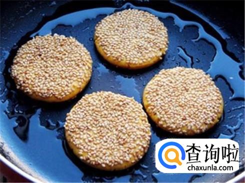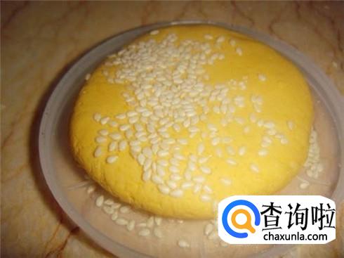 面团醒半小时后,用手把面团搓成一个个的剂子,然后用手轻轻一压,两面撒上芝麻。