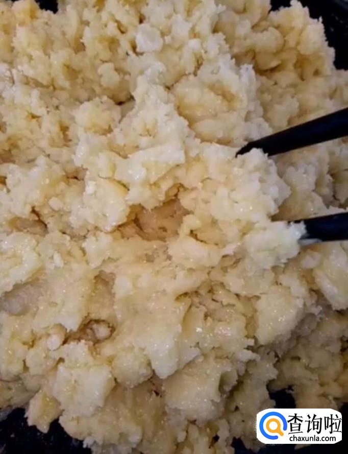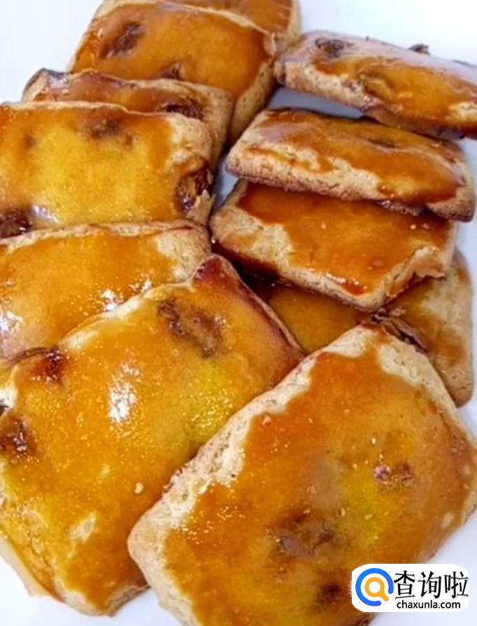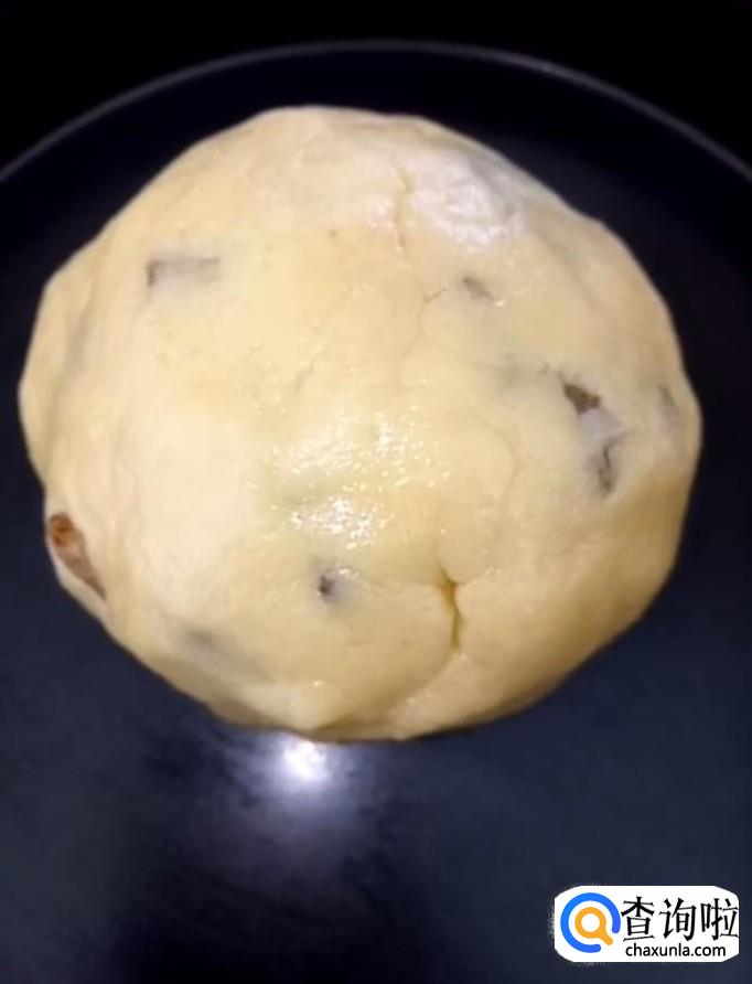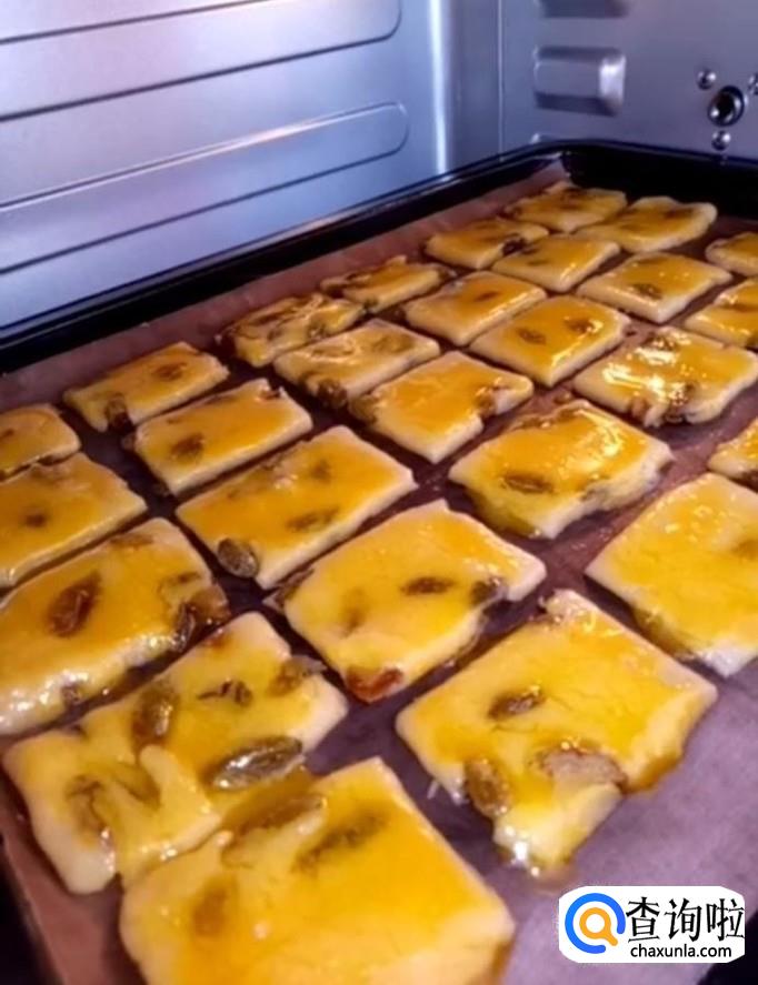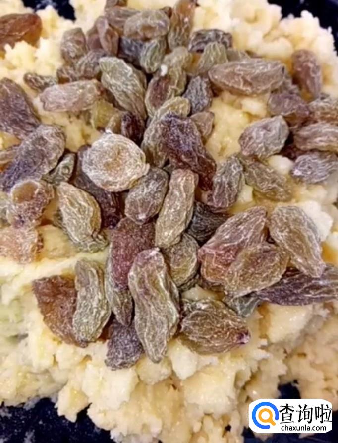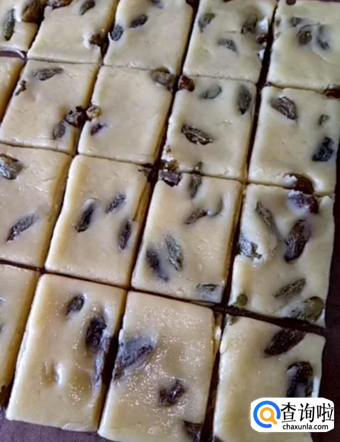 然后我们再放入适量的葡萄干,揉成面团,接着我们用擀面杖将面团擀成薄片,用刀切成小块