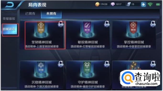 然后在左侧点击回城徽章,这样就能显示出你拥有的回城徽章,点击佩戴即可。这样就可以在游戏中看到效果了。