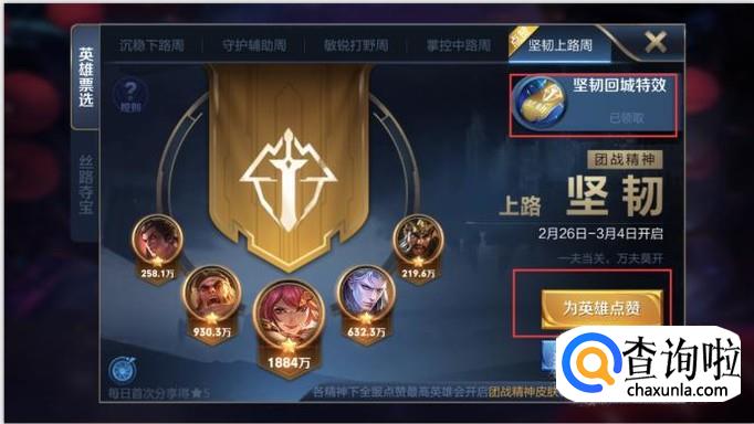 点击之后我们就可以看到活动详情,徽章的获取方式为需要点赞英雄40次,就可以领取一个7天的回城徽章。