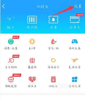 在QQ钱包界面点击右上角的“设置”,如下图所示。