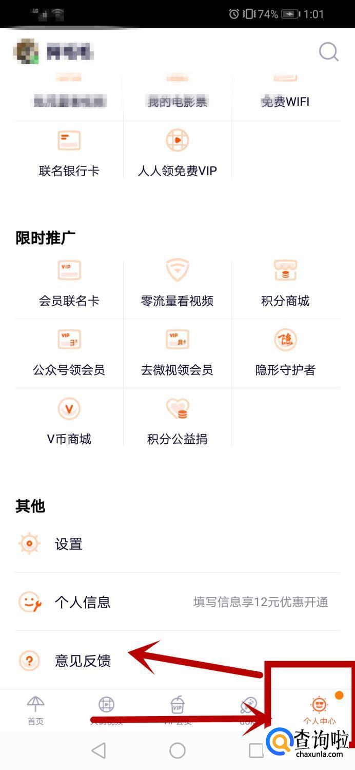 进入界面后,点击“个人中心”,找到意见反馈,点击它。
