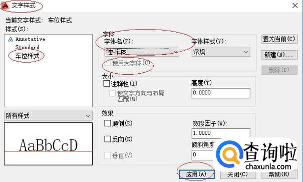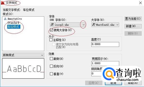 弹出"文字样式"对话框,如图所示。选择"当前文字样式→车位样式"项,取消勾选"字体→使用大字体"复选框。