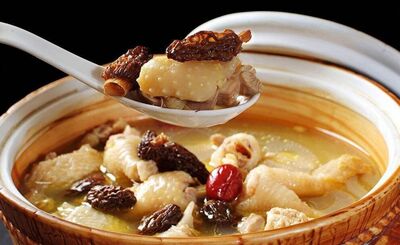 制作方法:光鸡洗净斩件,氽水备用;羊肚菌洗净后用温水泡发半小时;将所有材料加入汤煲中,加水1.5-2升,以武火煮15分钟后改文火煲一个小时,加入少量食盐调味即可。