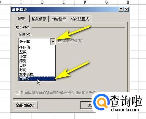 接着,弹出操作面板,在允许这里点击下拉按钮,在弹出的列表中选择:自定义