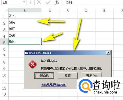 输入公式后,点击确定。那么,A列的设置就完成了。接下来,我们输入数据。当我们不小心输入重复输入了相同的数据时,就会发生警告,提示输入非法值。我们重新输入正确的数。