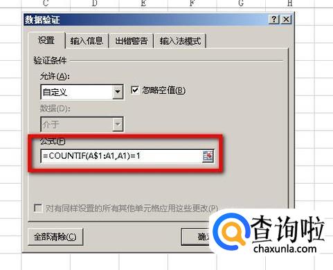 公式解释:公式中COUNTIF函数,我们可以理解按条件统计单元格个数的函数;而括号内的左边这一段是要统计的单元条区域,注意的是A1要加上绝对引用符号;括号内右边的A1单元格即是条件。那么,整个公式在这数据验证中的意思是当以A1的数值为条件在指定的数据区域内统计出的单元格个数等于1时,允许输入数值;如果统计出的单元格个数不等于1时那么不能输入数值。