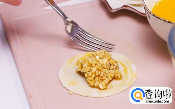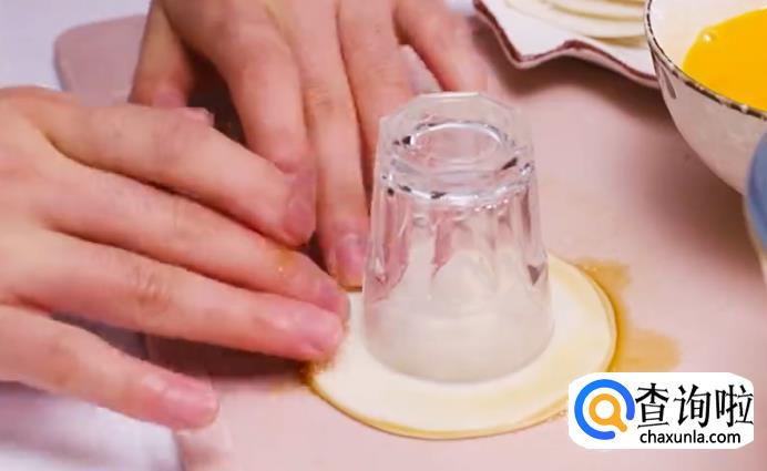 上面再盖一张饺子皮后,用玻璃杯压在饺子皮正中间,用力压紧,将饺子皮边沿压紧粘牢。
