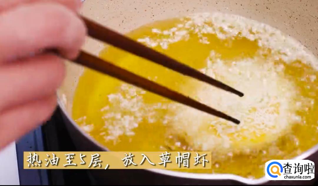 锅里油热到5成左右,放入草帽虾炸至金黄色捞出。