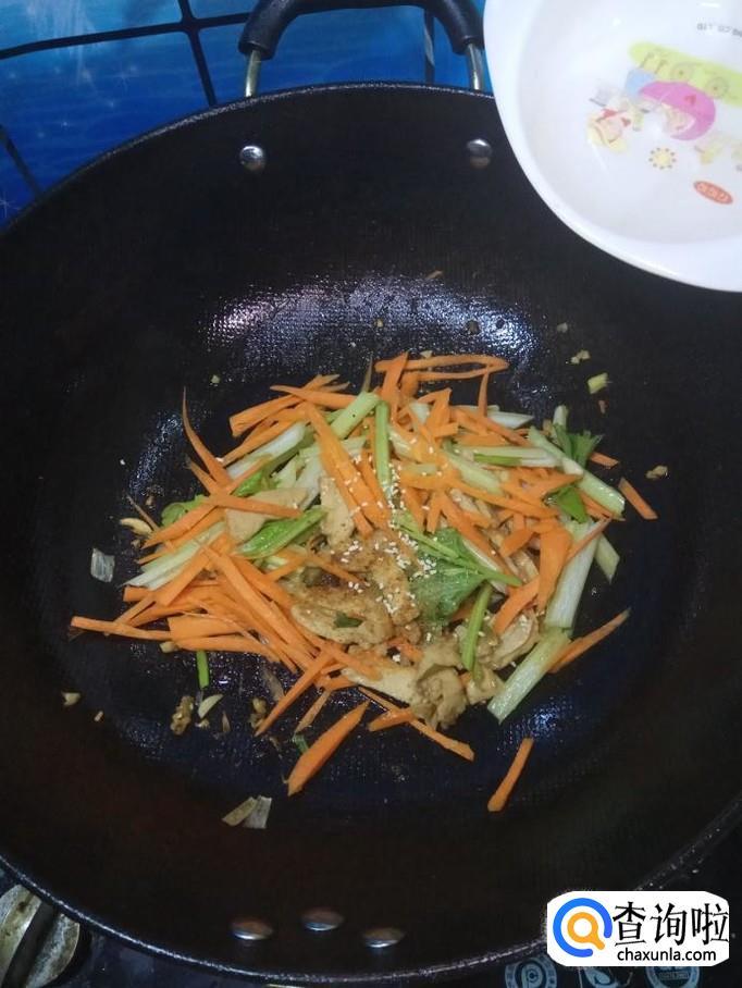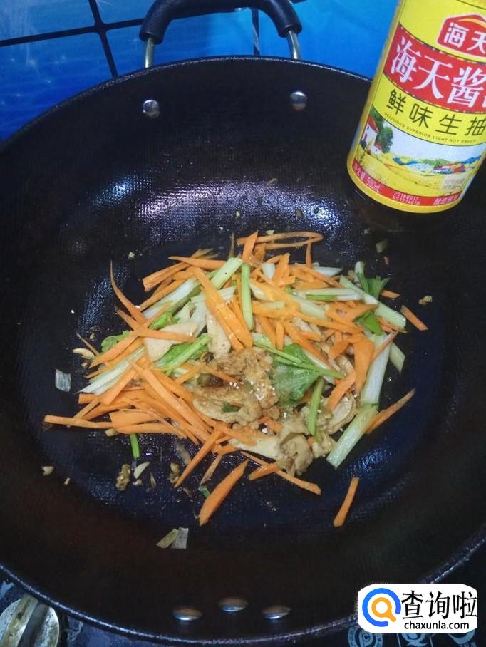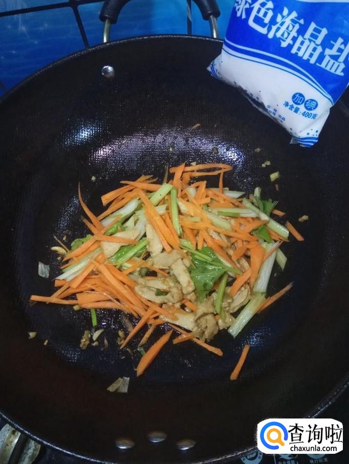 将准备好的胡萝卜粗丝也倒入锅中,和芹菜,鸡脯肉一起翻炒一下。
