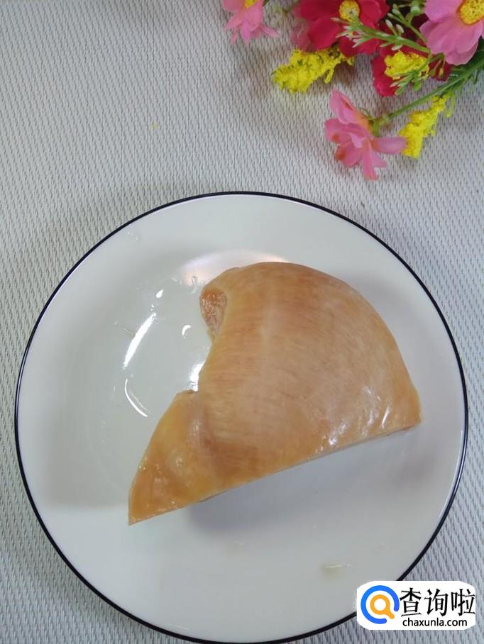 准备适量芹菜,洗净后摘去叶子,放入盘中备用;准备一个胡萝卜,洗净备用;再准备适量鸡脯肉,清水中加少许食盐,将鸡脯肉泡十分钟左右,洗净备用。