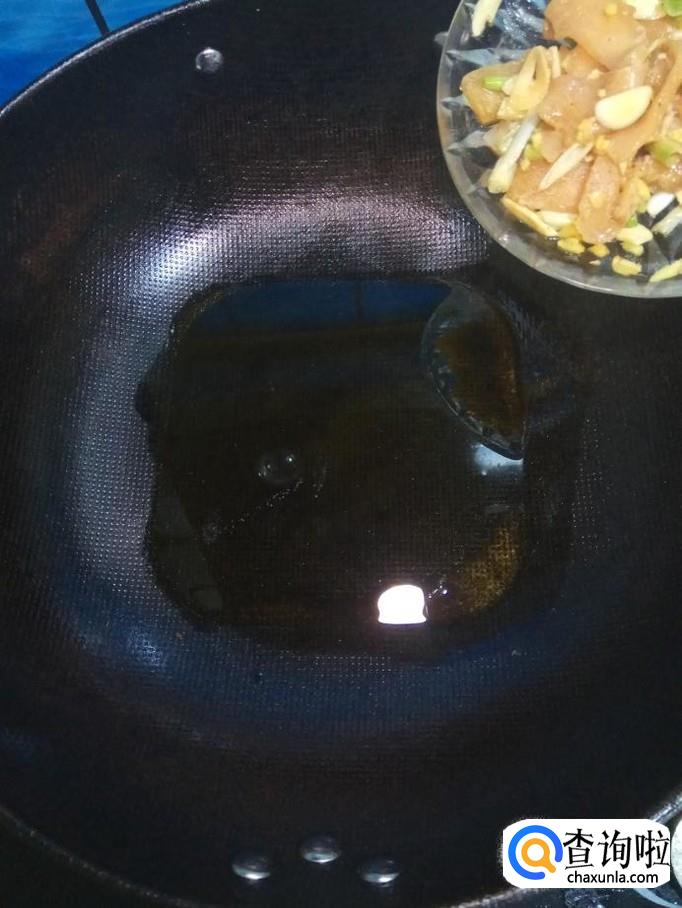 炒锅中放入适量油,油热后将鸡脯肉倒入锅中炒香,炒至鸡脯肉颜色发白就可以了。
