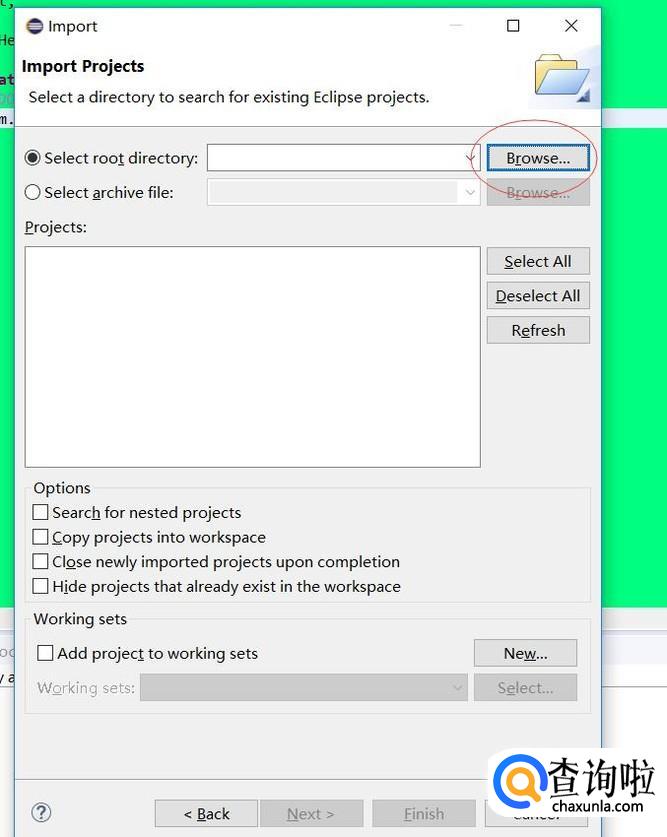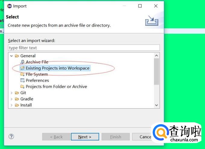 选择General->Existing Projects into workspace,点击next