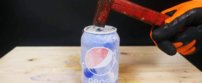 因此,在零度以下的一定温度范围内,可乐均是液体,且体积会不断膨胀。这会导致罐内压力增大。(压力增大也会令凝固点进一步降低,但这个影响不是很明显。)然后可能会发生以下三种情况:
