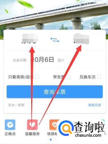 进入之后,在图示位置选择火车的起始地,还有目的地,点击“查询车票”,如图所示。