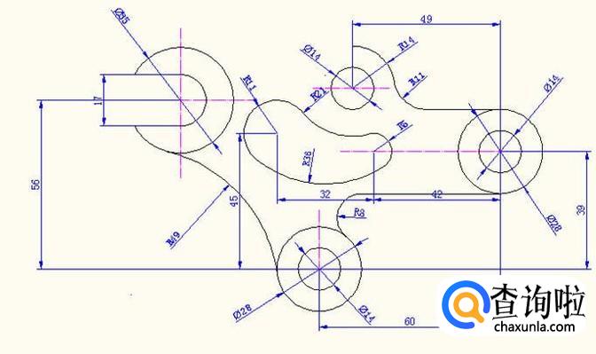 绘图步骤:建立三个图层,分别为绘图、尺寸标注、辅助线图层;确定相关尺寸绘制辅助线,先画两部分直径为14、28 的两圆,再画直径为17、35的两圆,分别使用通过象限点画水平线与圆相切、使用画圆中的T 画相切圆完成各部分的直线和圆弧相切;图形的中间部分为两个圆与两段圆弧相切,画法与之前相同。图形最上部圆心的确定是使用辅助线画法来确定,依次可以完成相关圆和圆弧的相切;修剪多余的线段和圆弧即可完成整个图。最后进行尺寸标注。
