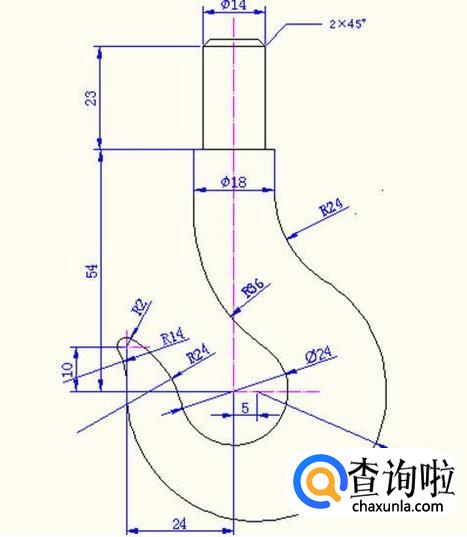 绘图步骤:建立三个图层,分别为绘图、尺寸标注、辅助线图层;确定相关尺寸绘制辅助线,先作直径24和R29的圆,再画出图形上部的矩形框和倒角部分;再作R24和R36的圆分别与竖直直线和前面两个圆相切,修剪多余线段和圆弧。用同样的方法画左侧的圆R2和相关的相切圆再修剪多余圆弧即可完成,最后进行尺寸标注。