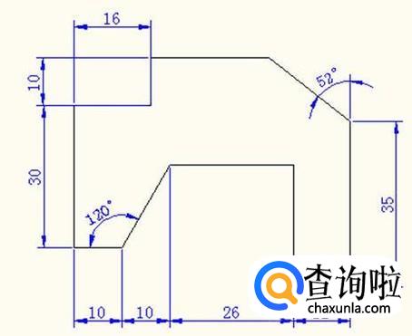 绘图步骤:先建立两个图层分别是绘图、尺寸标注图层;外框从点(0,0)开始,分别沿上、右两个方向画各线段,至于斜线段可使用极坐标追踪模式在已知角度和长度的情况下画出;内框从点(11,10)开始,上端线先画一条水平长点的直线,画相应斜线与其相交,再修剪即可;最后进行尺寸标注。