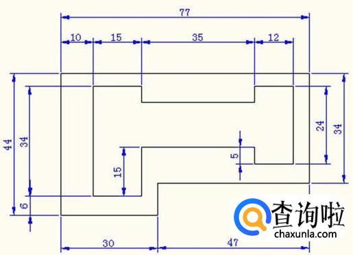绘图步骤:先建立两个图层分别是绘图、尺寸标注图层;外框从两个方向(上、右)利用正交模式画,内框从点(10,6)开始,利用正交模式和相关线段尺寸画出;最后按照原图进行尺寸标注。