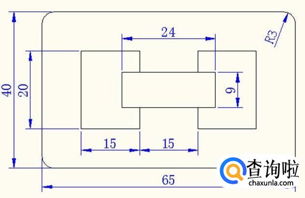 绘图步骤:建立两个图层分别是绘图、尺寸标注图层,使用RECTANG命令和相关坐标绘制圆角矩形框,分别用两点坐标法画三个矩形框,剪切多余的线段;进行尺寸标注。