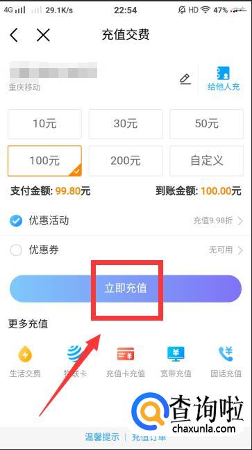 点击之后,进入【充话费】的页面,选好充值数额,点击【立即充值】。
