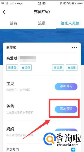 添加完成后,点击爸爸手机号码下方的【充话费】即可。