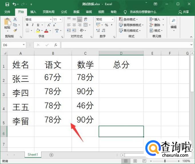 最后,我们在D2单元格输入【=B2+C2】,按下回车即可得到总分数,鼠标下拉填充即可得到剩余单元格数据