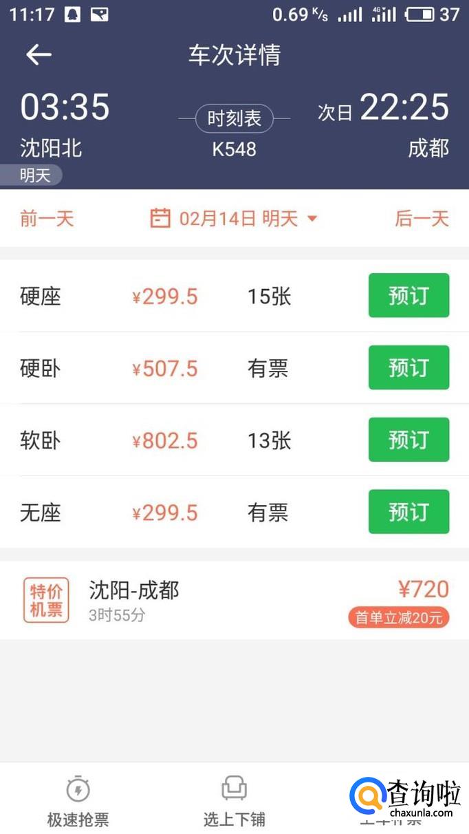打开12306输入你的乘车区间,输入后选择你的购票类型,然后点击预定。