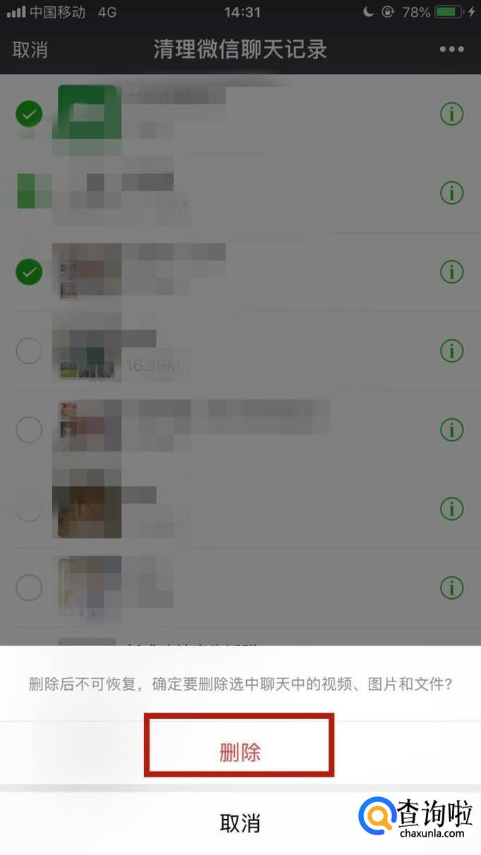 接着选择要删除的聊天记录并点击删除,如下图所示。