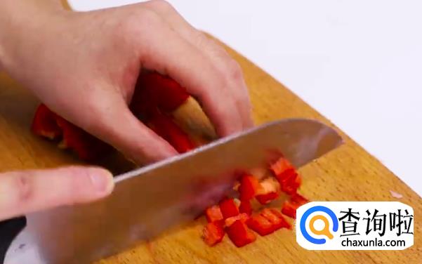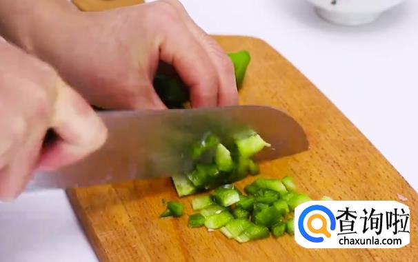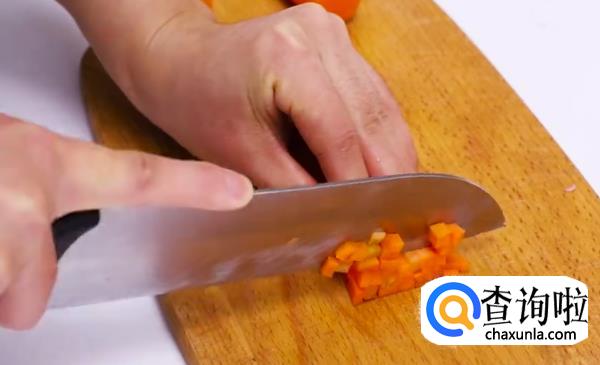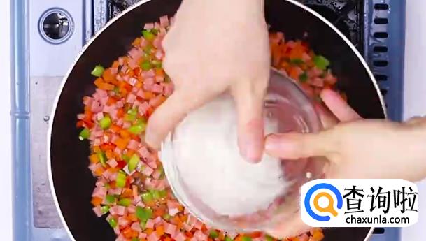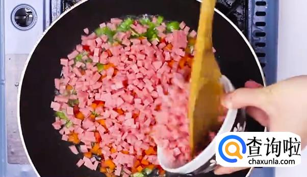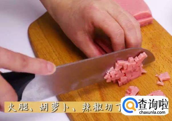 先将火腿,胡萝卜,辣椒切丁备用。