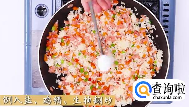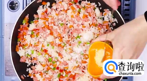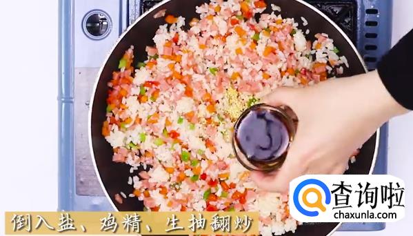 火腿,菜椒,鸡蛋,米饭,芝士,鸡精,生抽,面粉若干。