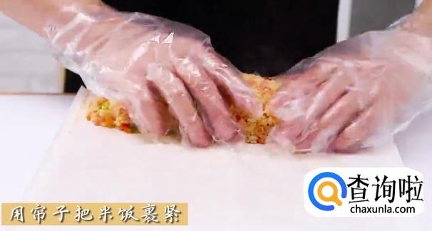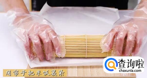 用专用的寿司帘子将米饭裹紧待用。
