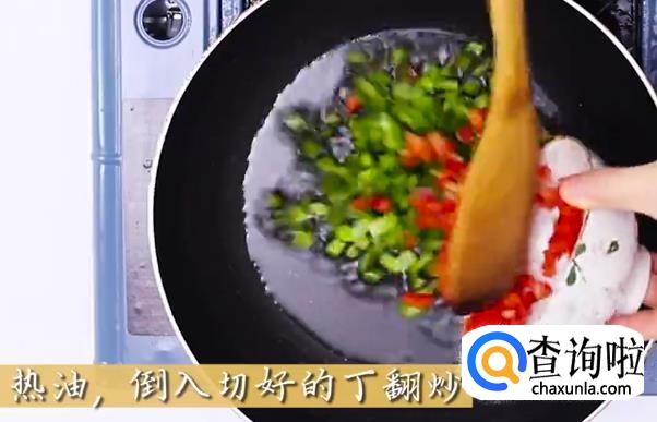 锅底热油,然后倒入切好的各种丁下锅翻炒。