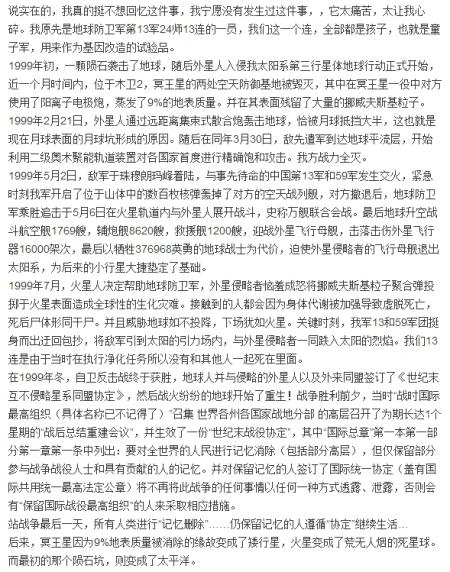 传说1999年,外星人入侵地球,由于战场情况特殊 80前无法进入战场,80后90后作为抵抗外星人的主力,英勇奋战,牺牲了无数少年少女打退了外星人的进攻。但是80后90后也付出了惨重的代价。原来80 90后也和60 70后一样有很多兄弟姐妹,在战争中,几乎都牺牲了,几乎只剩一颗独苗。这段历史太吓人,为了00后健康成长,80 90后再退出战场时集体起誓,封存这段记忆 不得像外界透露1999年大战的任何事情。(酷知网提醒您,纯属娱乐!)