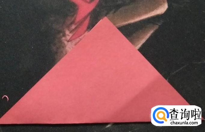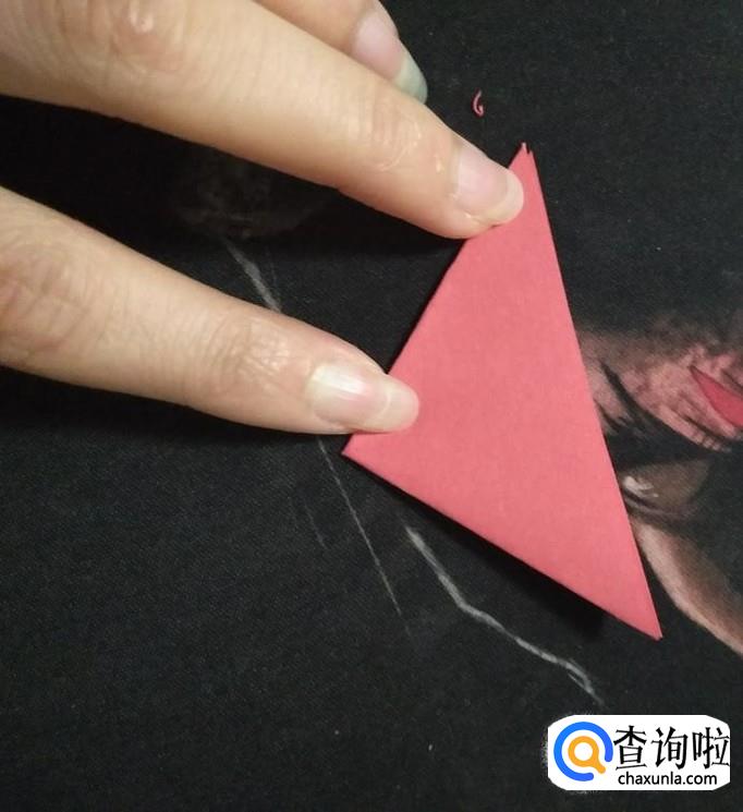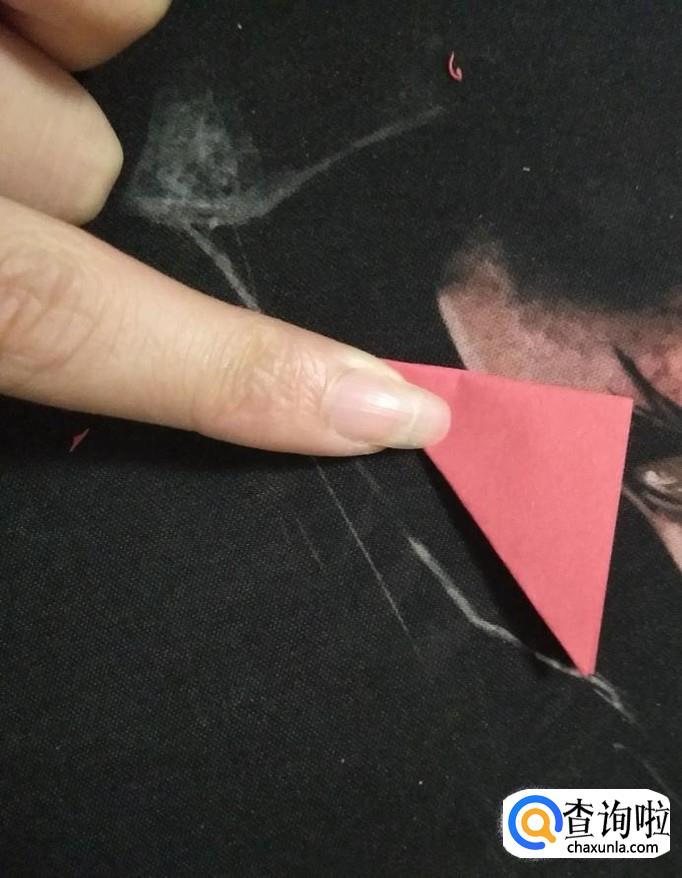 5x5cm的大红色方纸角对角对折两次,折好后如下图二,然后再对折一次,