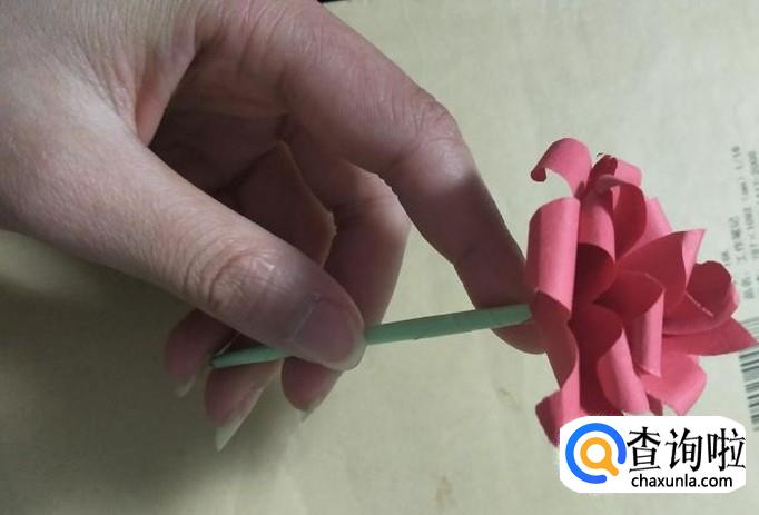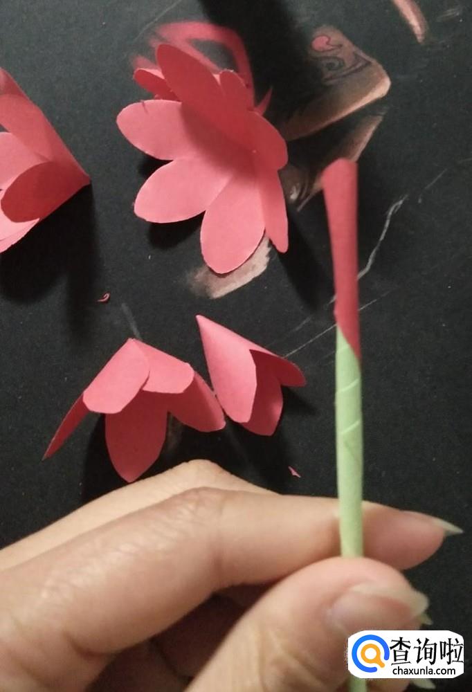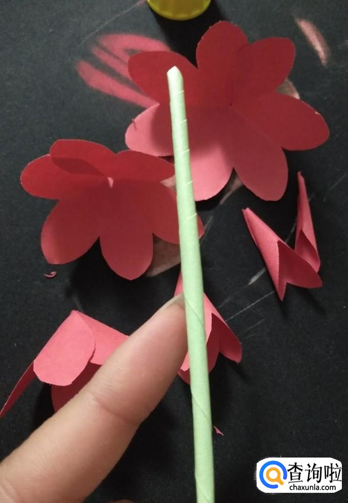 将最小的一张纸插入棍中,然后插第二小的一朵花,依次类推,直到把六朵花全部插进棍中,唱好后如下图3所示