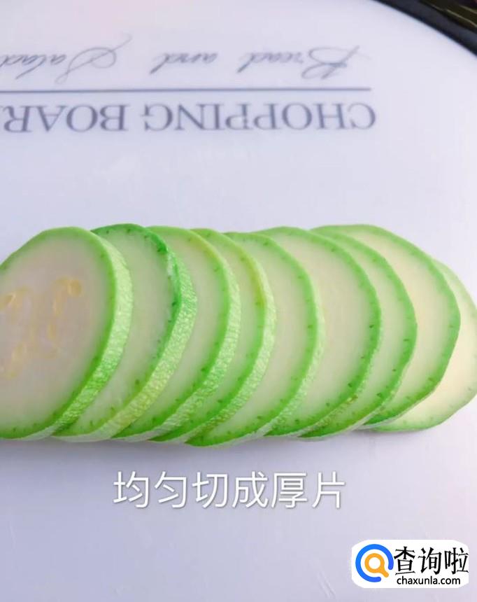 然后把西葫芦均匀的切成厚片,如下图所示。