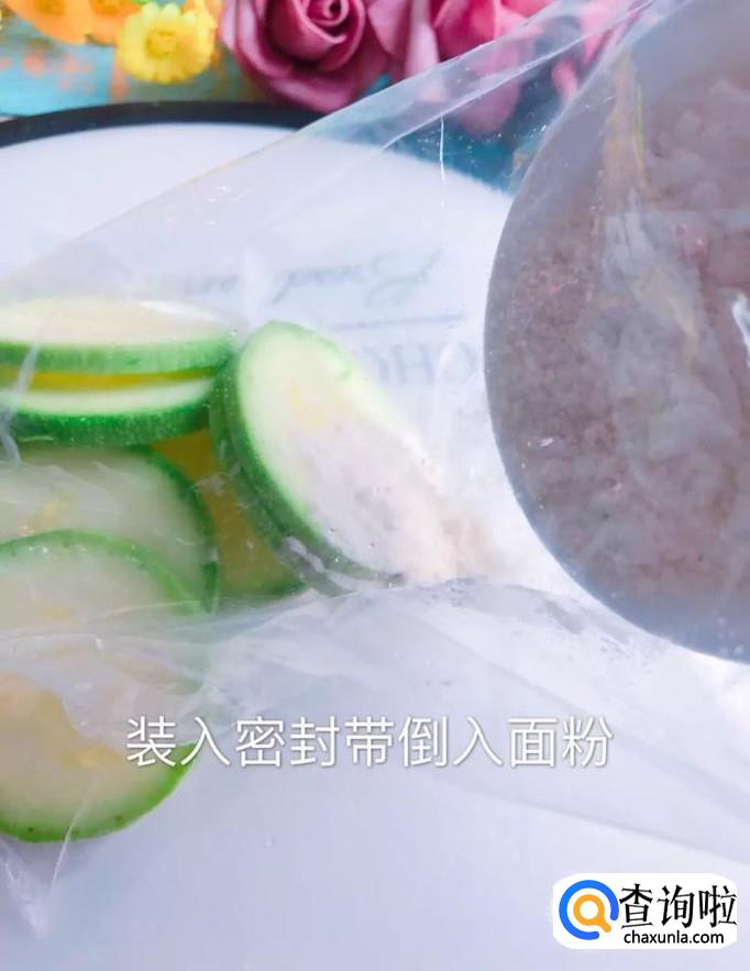 接着将切好的西葫芦装入密封袋,倒入面粉甩均匀,如下图所示。
