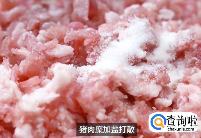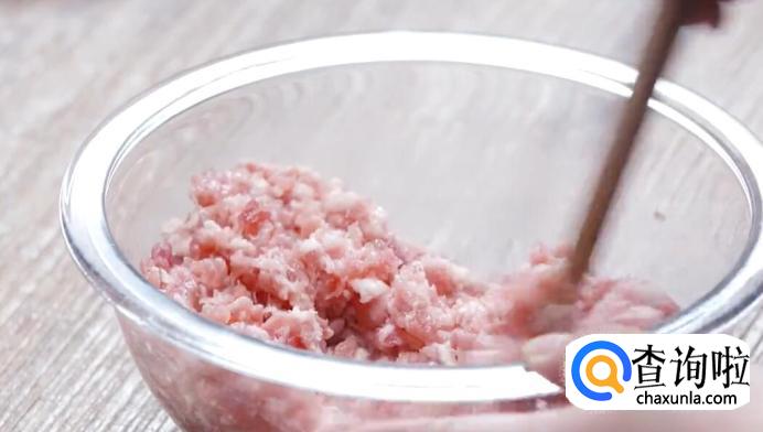 先制作酿在田螺里的肉馅。把猪肉糜加盐打散。