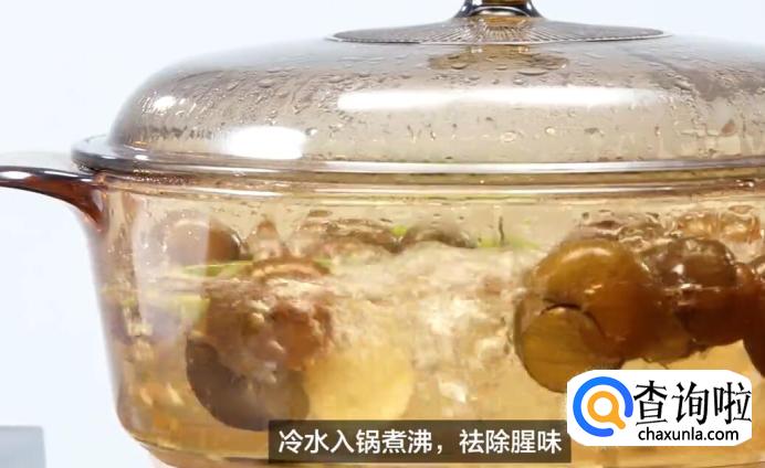 螺壳加葱姜水里的葱姜一起,冷水入锅煮沸,祛除腥味。