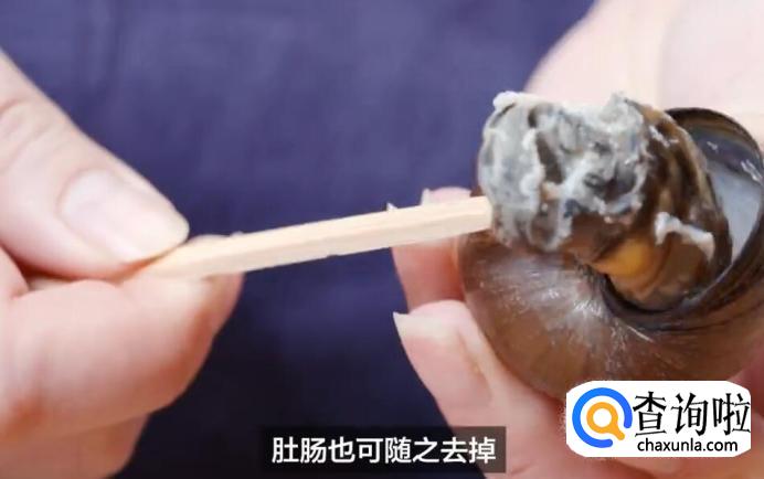 然后剪掉尾部,取出螺肉,肚肠也随之去掉。因为田螺买来后无需提前净水吐沙。