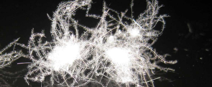 羽绒是长在鹅、鸭的腹部呈星朵状的绒毛(上图右边绒毛),就像蒲公英的种子一样,而羽毛是片状的。