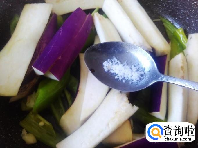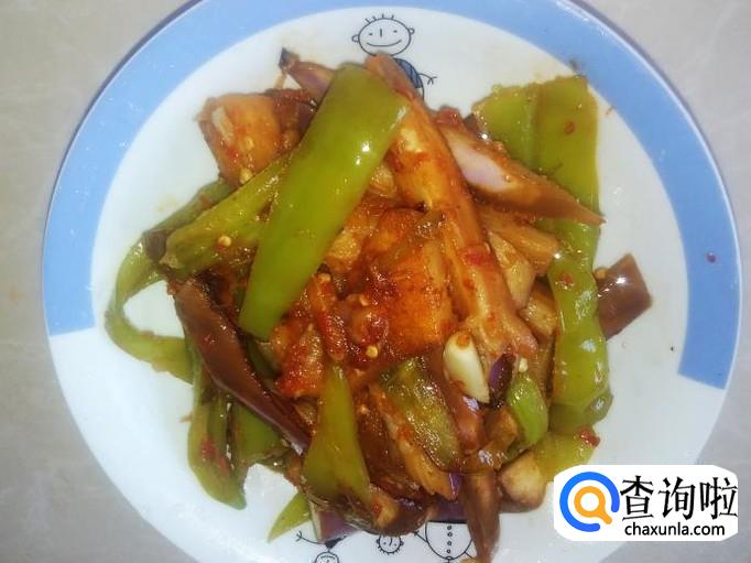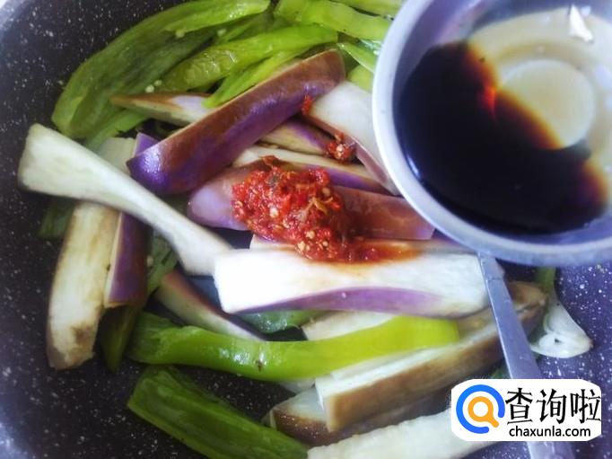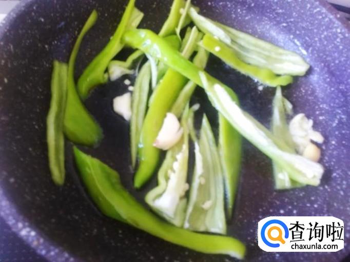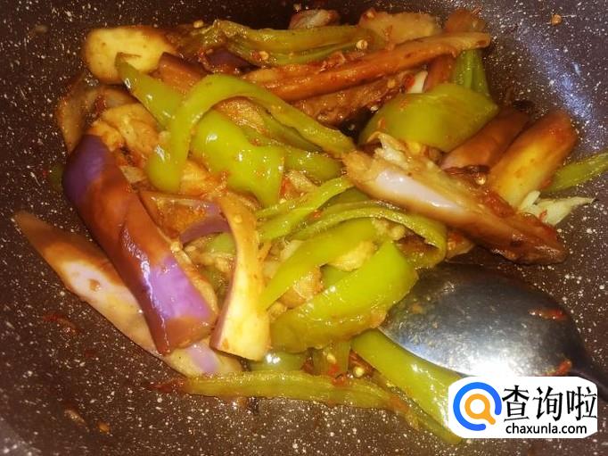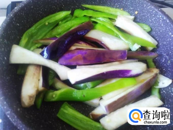 翻炒到茄瓜和青椒变软为止,然后下2小勺水进去。