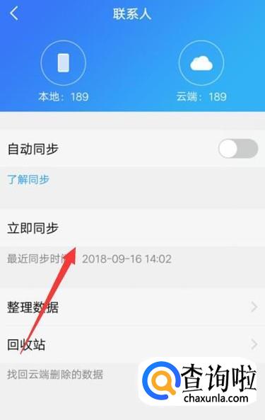 进入之后,点击图示位置的“自动同步”即可恢复联系人,如图所示。