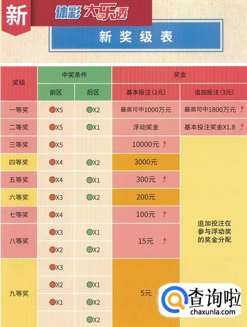 七等奖:投注号码与当期开奖号码中的任意3个前区号码及任意1个后区号码相同,或者任意2个前区号码及2个后区号码相同,即中奖;