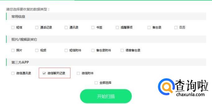 连接手机到电脑上,运行已经安装好的软件,软件会自动是识别到已经连接好的设备,并弹出数据类型,勾选聊天记录进入扫描。