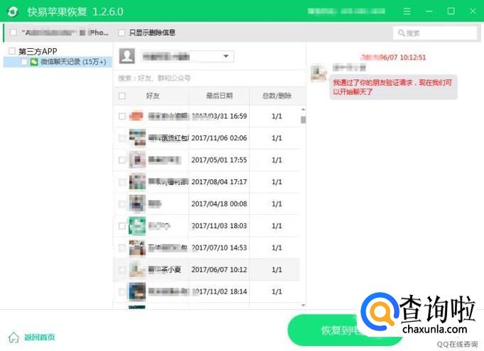 完成扫描后,从扫描出来的结果中可以看到联系人名字,选择要恢复聊天记录的联系人,进入查看详细的内容,并找到要的数据进行恢复即可。