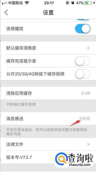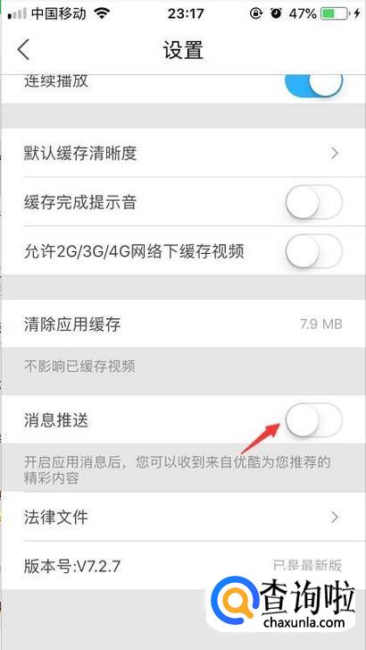 关闭后如下图状态,我们不会再接收到优酷的任何推送消息了。