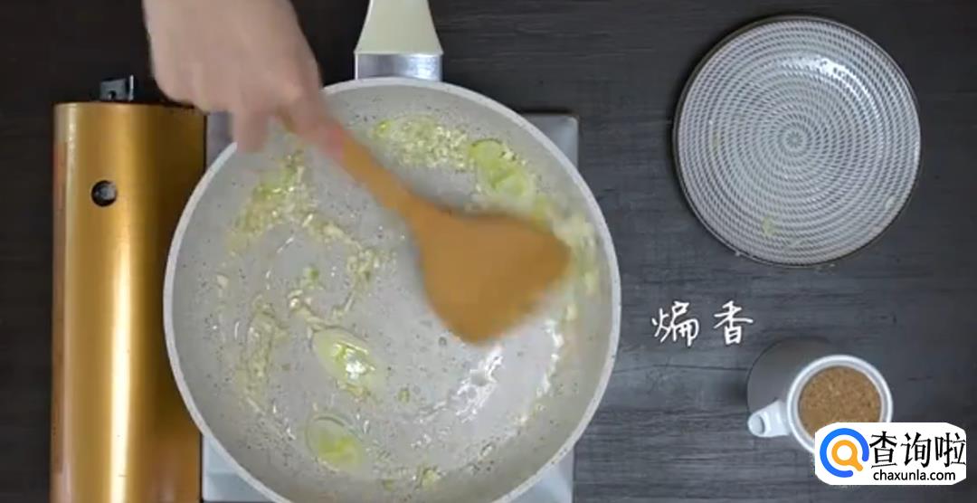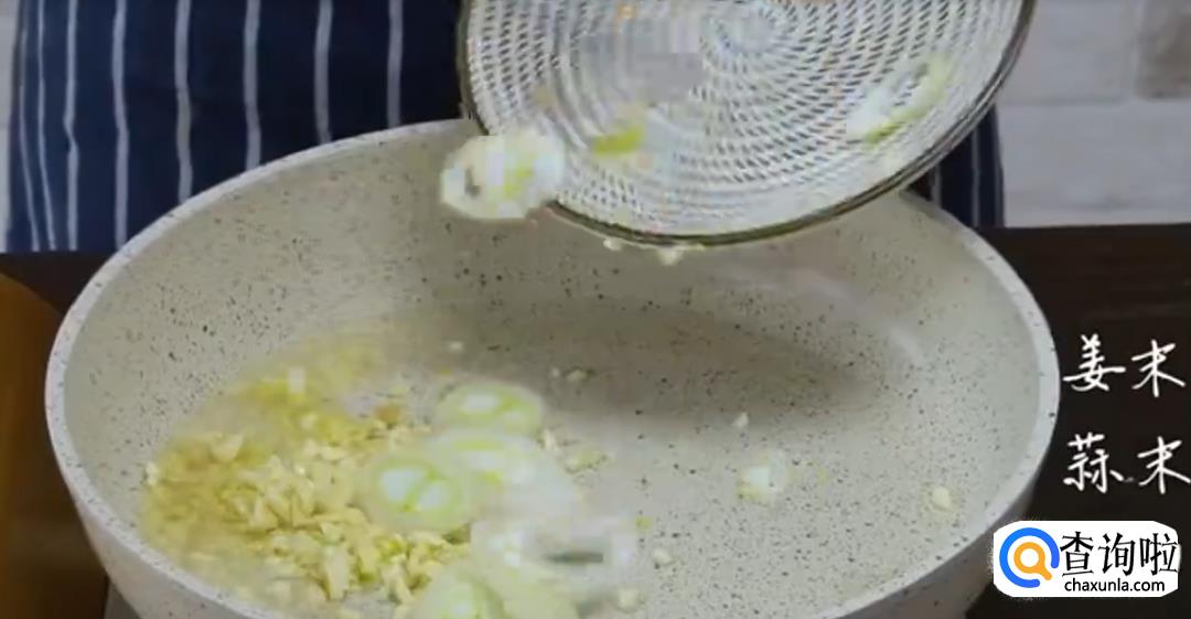 热锅冷油,下姜末,蒜末,葱段爆香。
